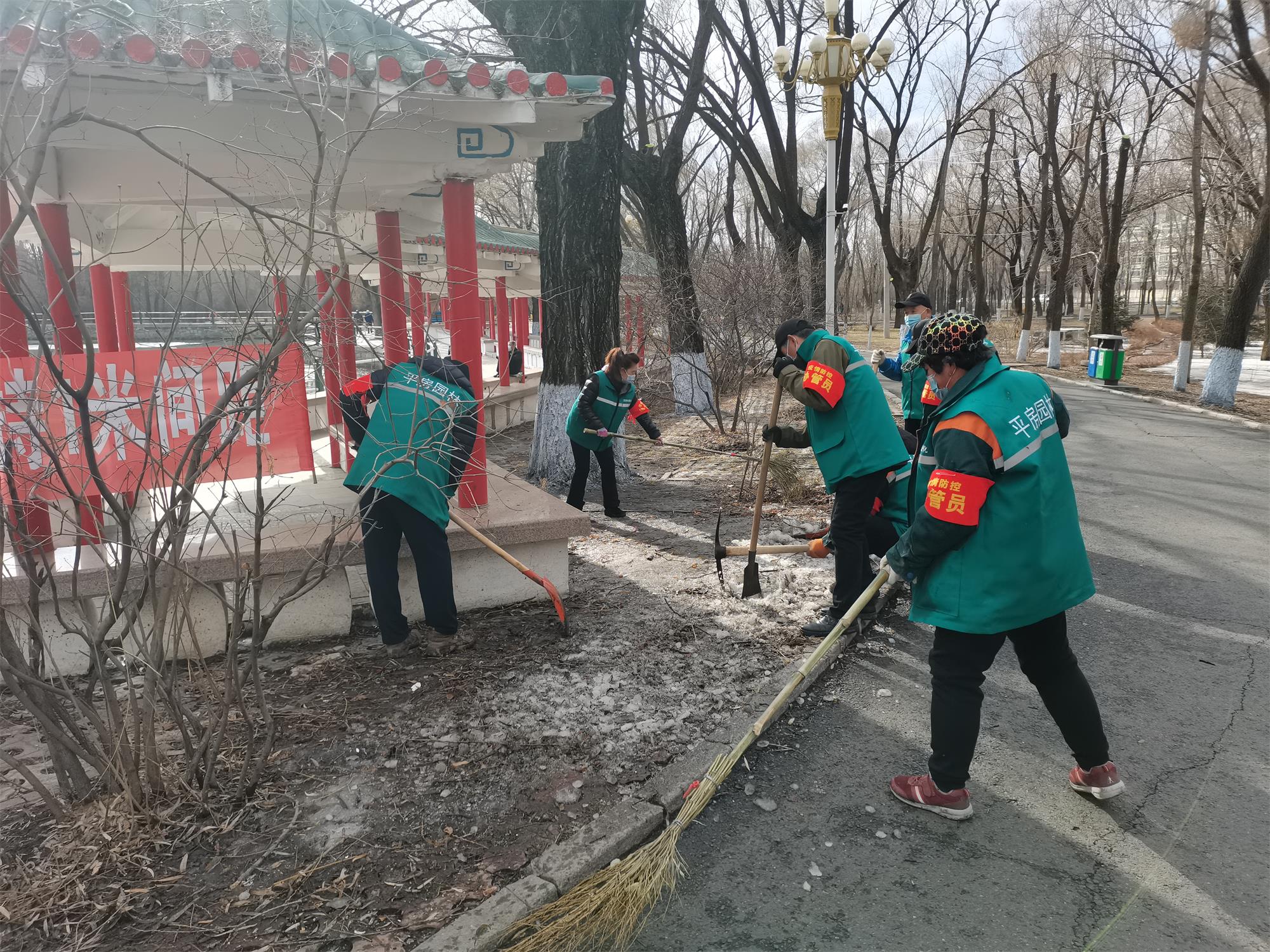 截至目前,累計清理殘雪、垃圾、雜物4233噸,清理綠地衛生500795平方米,清掏綠籬片植2800平方米,修剪行道樹4132株、喬木1827株、灌木3219墩,清理亂貼亂畫5000餘處,消殺清洗垃圾箱167個,擦拭隔離帶護欄10000餘延長米,簡易維修街路1500餘平方米,邊石321延長米,拆除破損牌匾、燈籠等物品1070個。每日對果皮箱、健身器材、公共座椅等設施進行擦拭。