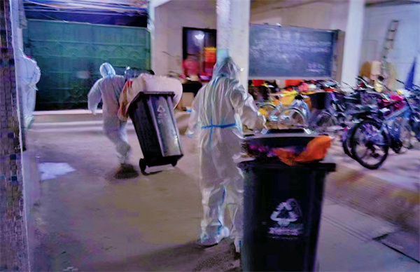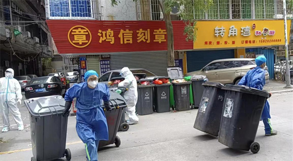 這是袁燕第二次參加管控區域衛生保障工作。這次管控區域範圍廣、保潔面積大,居民的生活垃圾相比往常大量增加,居家隔離的第二天,垃圾量激增。袁燕和隊友留在了臨時管控區域負責住戶的生活垃圾清運和地面清掃、消毒,每天清晨6點開始工作,將收集的垃圾裝桶、轉運並統一處理,確保日產日清,保持環境乾淨衛生。