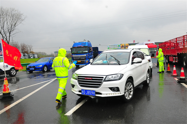 3月25日,巢湖突降大雨。合巢蕪高速半湯收費道口大車、小車一輛接一輛向執勤點湧來。交警李強等幾大步衝到路中央,哨子吹起來,雙手揮起來,步子邁起來,指揮一台台車輛停放好。「請配戴好口罩,下車登記信息。」「你從哪裏來?途中經過哪裏?要到哪裏去?」「請出示身份證、行程碼、健康碼,有無核酸檢測報告?」民警挨個仔細詢問着。