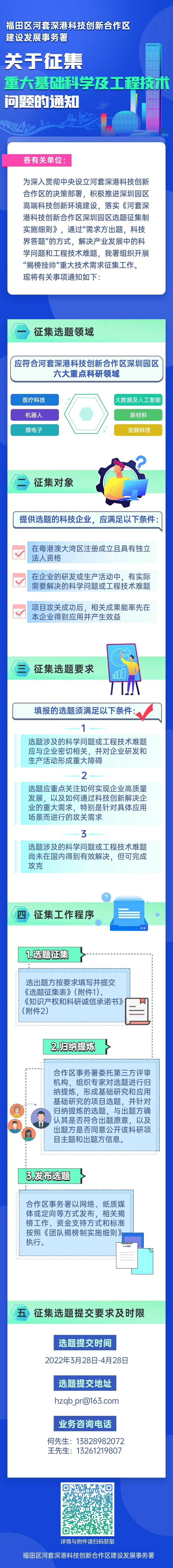 3月29日,記者從深圳市福田政府在線獲悉,為深入貫徹中央設立河套深港科技創新合作區(以下簡稱「合作區」)的決策部署,積極推進深圳園區高端科技創新環境建設,合作區深圳園區「揭榜掛帥」重大技術需求徵集工作於3月28日正式啟動。