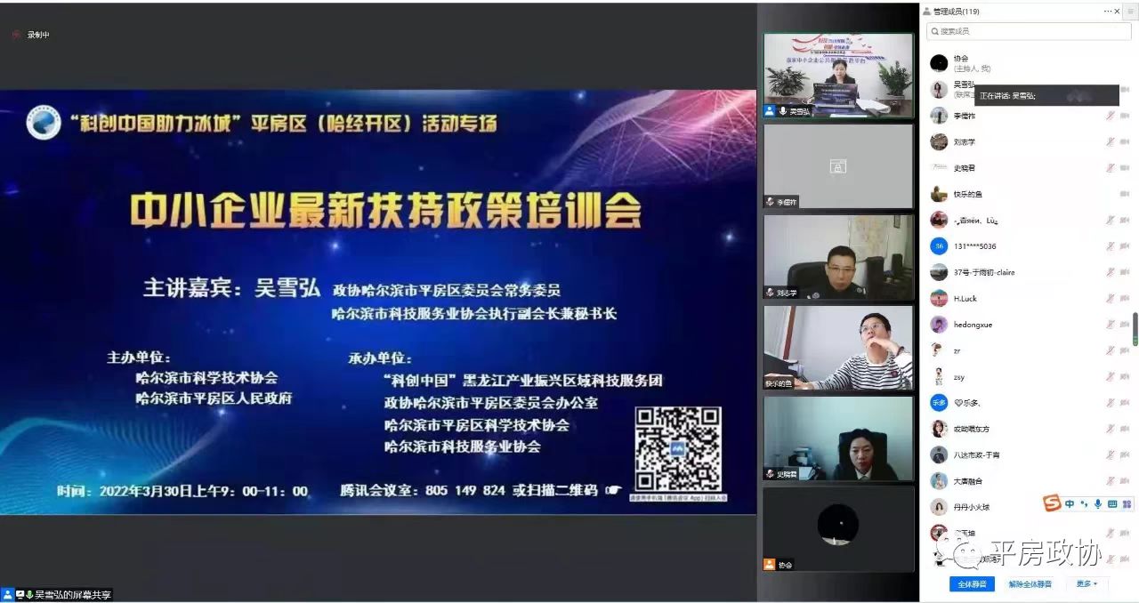 為落實中國科協、省、市科協關於「科創中國」的具體要求,發揮科協組織「服務創新驅動發展、為黨和政府科學決策服務」的職能和橋樑紐帶作用,3月30日,「科創中國助力冰城」平房區(哈經開區)活動專場暨中小企業最新扶持政策培訓成功舉辦。哈爾濱市科協副主席姜海波、平房區政協主席王榮、區委副書記史曉君、區政協副主席李長征及平房區政協委員企業、哈經開區有關企業及各科技型企業等近300人通過騰訊會議參加培訓活動。