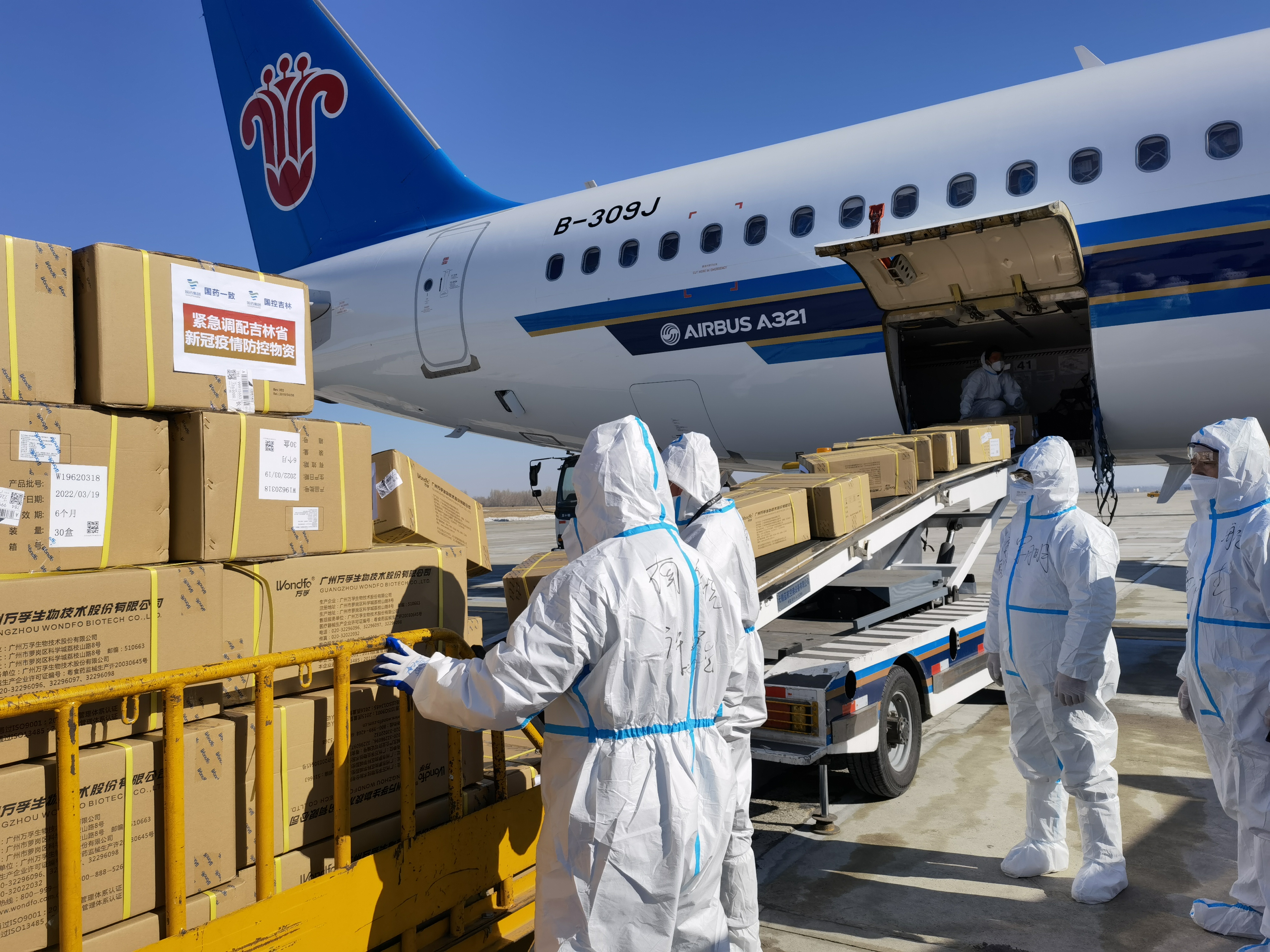 3月22日至3月29日期間,南航統籌安排,多個部門積極聯動,調配航班運力,安排空客A350、波音787等寬體機型執行航班任務,進一步助力吉林省疫情防控工作。南航吉林分公司充分總結包機保障工作經驗,根據重大航空運輸任務保障預案,提前召開包機保障準備會,進一步明確保障節點,加強對運行動態的持續監控,提升運行保障工作效率。結合「客改貨」包機特點,安排保障車輛,實現客貨艙同步卸機,確保醫療物資快速轉運。同時,根據醫療物資航班進港密集的情況,南航志願者和現場工作人員夜以繼日,在航班起飛前做好各項準備工作,並在航班落地前15分鐘全部就位,從凌晨到黑夜,將物資第一時間轉運到抗疫前線,助力吉林疫情防控一線。