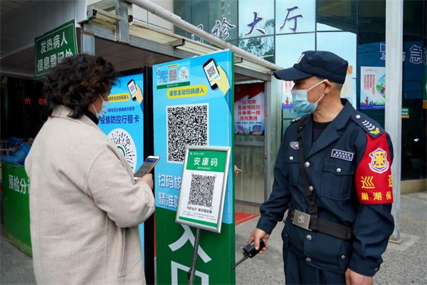 「您好,請出示一下健康碼、行程碼,請測量體溫,佩戴好口罩……」3月30日下午,在合肥市第八人民醫院南大門,巢湖市保安服務有限公司的保安隊員們從原先在大門口單一守衛登記、維持秩序,到成為嚴格落實進入人員測溫、掃碼、登記等第一守門人。按照疫情防控要求,進入醫院的所有人員均需科學佩戴口罩,測量體溫,憑身份證/安康碼(綠碼)和行程碼在醫院疫情防控通道核實身份後方可進入。