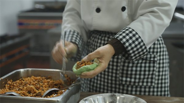 麵團製作完成後,捏成薄皮,再填入新鮮上市的春笋、徽州火腿肉、豆幹、雪裏蕻製作的餡,邊緣掐攏,這樣一顆清明粿便製作完成了,放入蒸籠裏蒸煮10到15分鐘,便可食用。