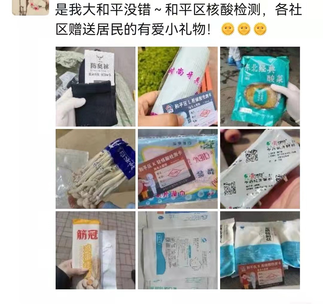 據了解,為了鼓勵和感謝全體和平家人們都能主動參與核酸檢測,和平區按照居民需求,將人大代表、政協委員、工商聯以及愛心企業捐贈的小禮物集結起來,分派到各個核酸檢測點位。由於每種小禮物的數量有限,不同街道居民收到的也就不一樣。這些愛心牌的「盲盒」小禮物,贈送給共守家園的和平人,更傳遞着一份信心:堅持就是勝利,堅持才能勝利。共守防疫成果,共享春和景明。(瀋殿成)
