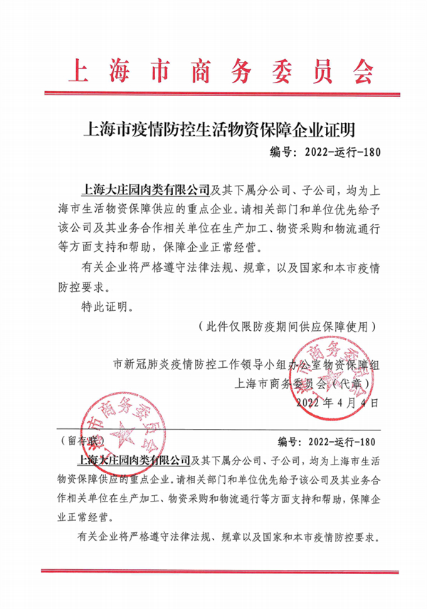 自3月28日起,上海開展新一輪切塊式、網格化核酸篩查,並對重點區域實施封控,上海也因此被按下了暫停鍵。大莊園作為中國優質牛羊肉供應鏈的龍頭,堅守防疫第一線,積極響應政府號召,在確保一線工作人員的健康安全前提下,獲得上海市商務委員會「上海市疫情防控生活物資保障企業」,為上海市民供應生活物資防疫保障。