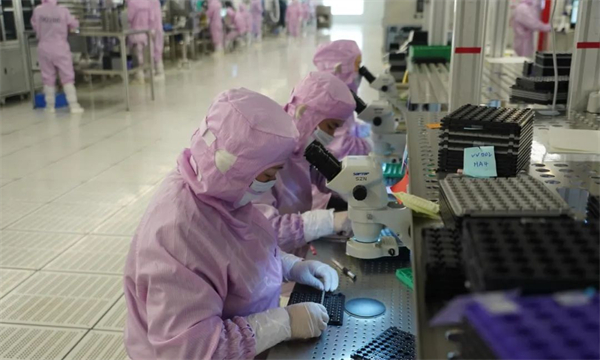 近日,我們來到安徽省巢湖市部分企業進行了探訪。戴上無塵帽、無塵口罩,穿上無塵衣、無塵鞋,「全副武裝」後的筆者在新思考電機(合肥)有限公司工作人員的帶領下,走進科技感滿滿的智能化無塵車間。在這裏,看到車間一派火熱忙碌的景象。兩條生產線開足馬力,組裝、檢查、性能測試……幾十名員工分工細緻、各司其職,有條不紊地在各條產線上忙碌。