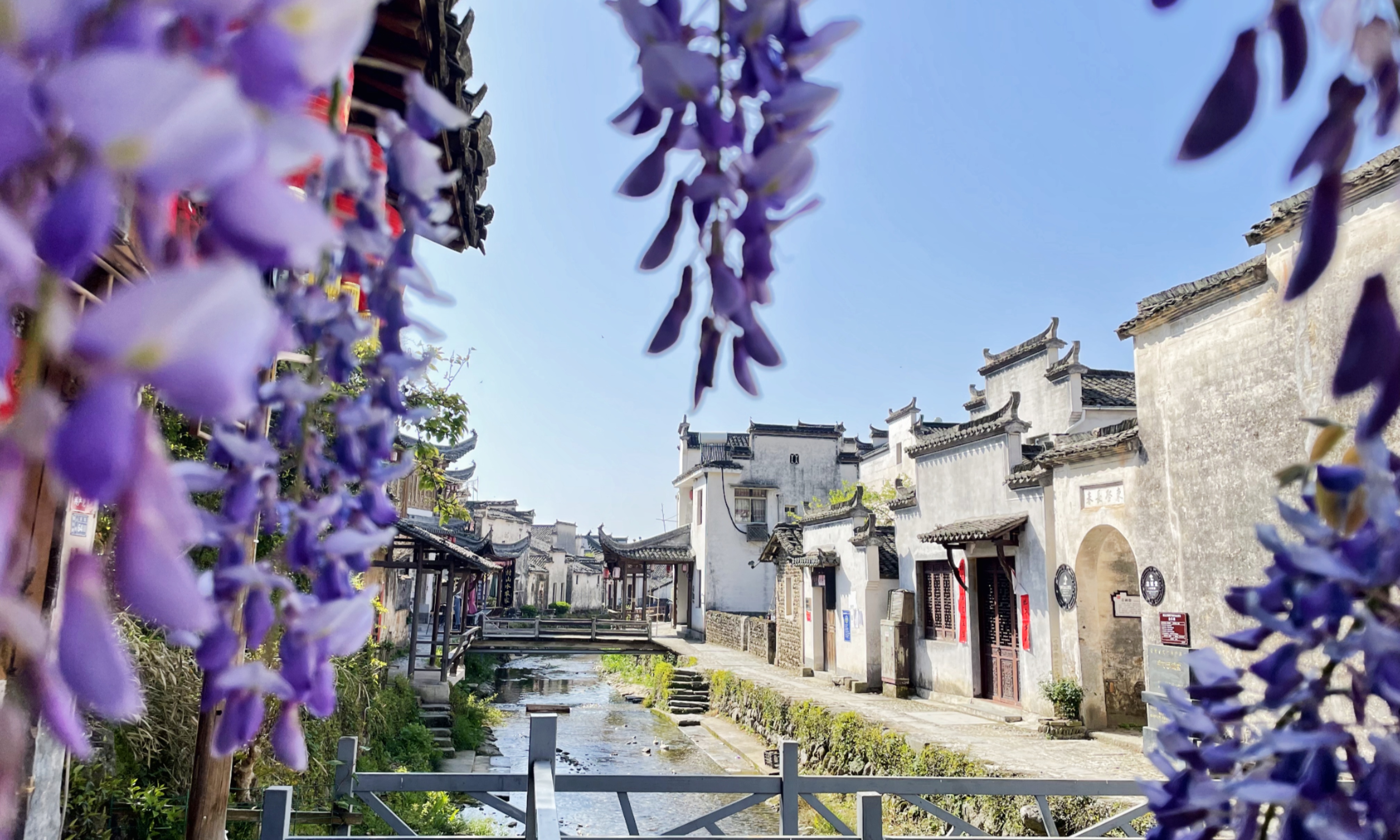 過駟車橋,溪邊木欄涼亭,可納涼觀景,碧水淙淙中游動著成群的小河魚,村口有一株烏桕樹,與對面幾株垂柳相應,一副烏桕綠柳伴溪上,金階駟橋通雕樓的畫卷緩緩展開。苔痕上階綠,草色入簾青,踏著青石板路,沿前街溪而上,兩側是隨勢建起的徽派民居,老屋的牆上和欄杆上,都是歲月留下的痕跡。