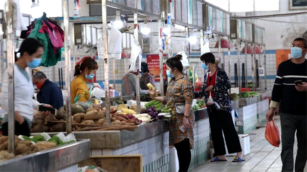 在潢涌綜合市場內,入口處防疫人員給進出買菜村民測溫、掃碼等,市場內的人流明顯增多,一派熱鬧忙碌的場景,各檔口擺放着各類新鮮的肉菜品種,充滿着人間煙火氣息。村民黃女士一早就來到市場,買了一大袋子肉菜;她表示,終於可以到菜市場買菜了,之前雖然村裏有配送但種類少,現在買菜多選擇更方便,要加菜慶祝一下正常生活的回歸。檔主黎女士一邊招攬生意一邊說:「大部分菜都賣完了,之前平時一天有七八百元營業額,今天一上午有四五百元,希望能越來越好。」