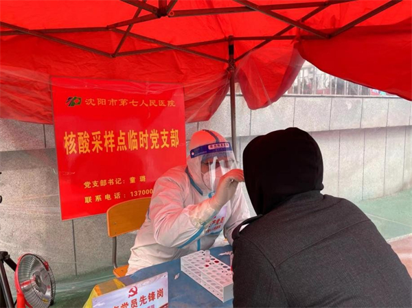 瀋陽市肛腸醫院護士長孫志傑作為4月7日北市場街道紡織社區核酸檢測點位的負責人,第一時間與金苑華城社區齊姝莉書記溝通,會同社區幹部、志願者一道擺放操作台、運送物資等,高效且順利地完成了一天5000多戶的核酸檢測。