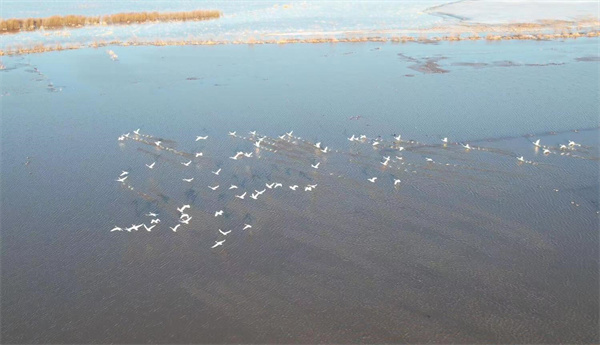 大天鵝是國家二級保護鳥類,主要以水生植物的根、莖、嫩葉和水生昆蟲,軟體動物等為食。近年來,隨着慶豐當地生態環境的改善,每年春季都會有數以萬計的候鳥經過這裏。它們將在這裏停留一段時間,然後繼續向北遷徙至俄羅斯西伯利亞進行繁衍生息。(裴振萍 王琳)