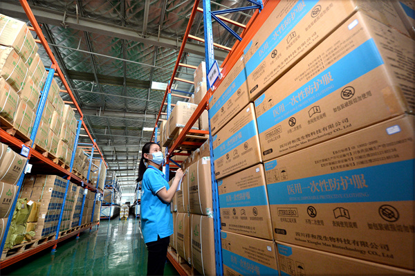 在四川祥和茂生物科技有限公司,防護服生產線也開足了馬力,工人們正細心縫製和包裝防護服,「現在防護服、醫用口罩的需求量很大,特別是上海、廣東、成都、重慶等地。3月份,我們就發出了5萬多套防護服、40多萬隻醫用口罩。」四川祥和茂生物科技有限公司副總經理黃宏介紹,「目前,公司已儲備了3萬多套防護服和300多萬隻醫用口罩的物料,正不斷增加產能,確保市場需求。」