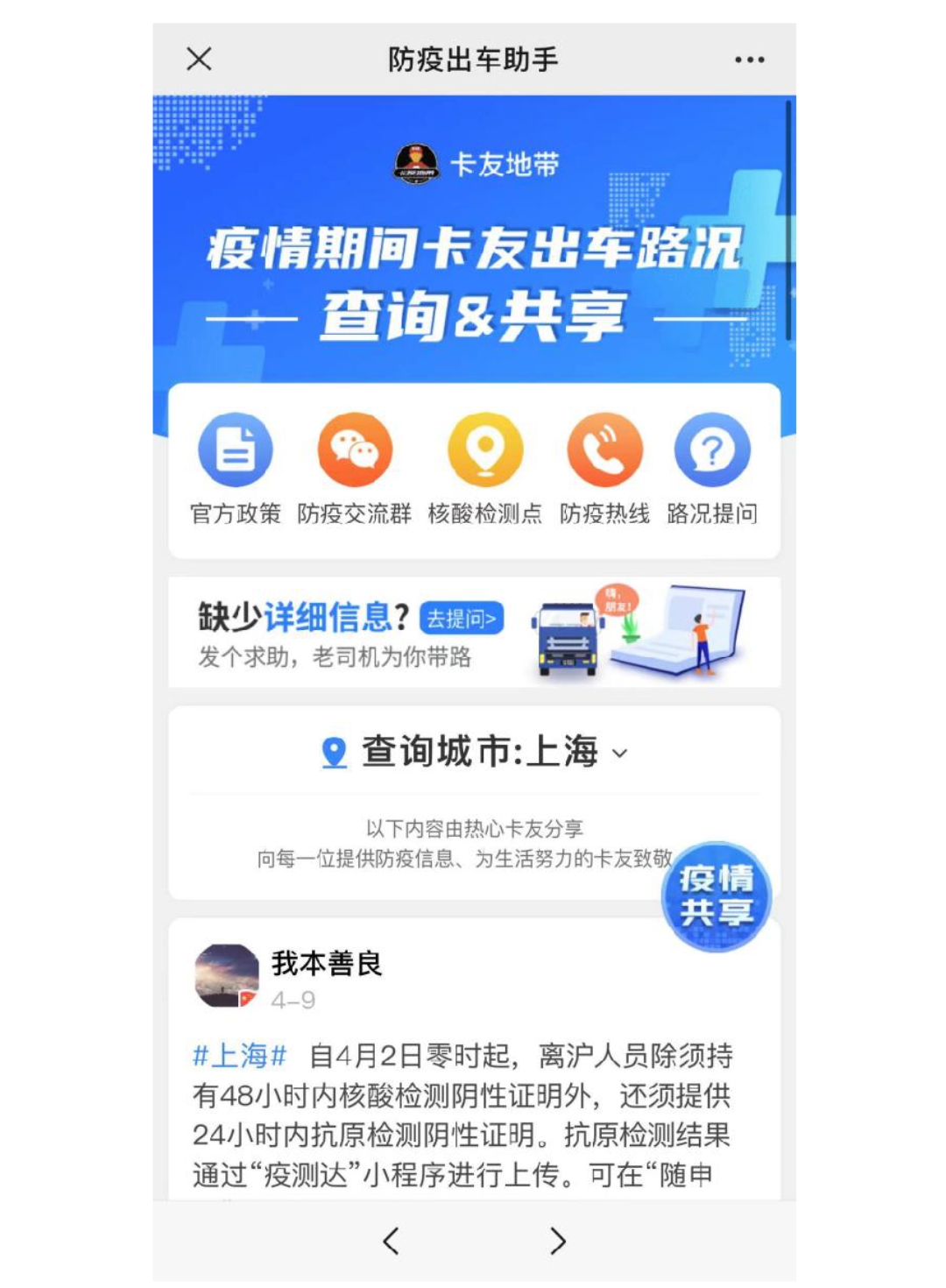 為此,本次上線的卡友地帶防疫出車助手主要涵蓋「防疫政策查詢、核酸檢測點查詢、防疫熱線一鍵撥打」等功能,多渠道滿足貨車司機的出行需求。