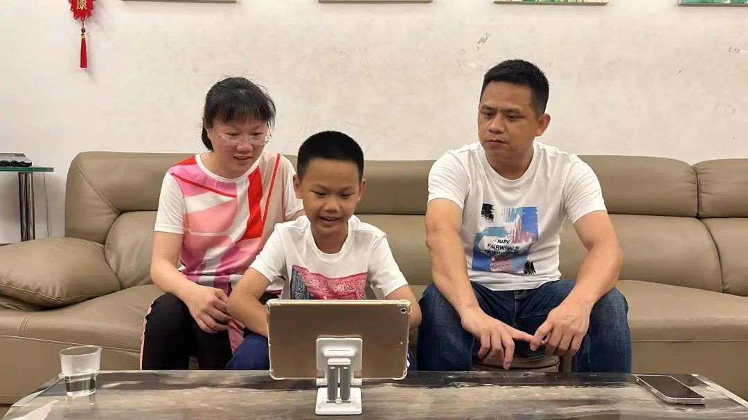 在家上網課的厚街中心小學學生方恩越在父母的陪伴下收看線上黨課。「學黨史賞文藝的形式非常好,讓孩子了解厚街革命歷史的同時也能受到文藝薰陶,以後我們會多帶領孩子一起學習黨史,和孩子一起進步。」爸爸方慶良表示。