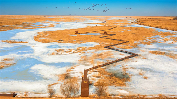 半湖碧水半湖冰,藍天白雲蘆葦叢。丹頂鶴引頸長鳴,白額雁「鷹擊長空」,大天鵝翩翩起舞、嬉戲覓食……眼下的七星河濕地猶如一幅美不勝收的油畫,美麗、和諧,處處洋溢着勃勃生機。(馬淑芬 王琳 攝影 周玉蘭)