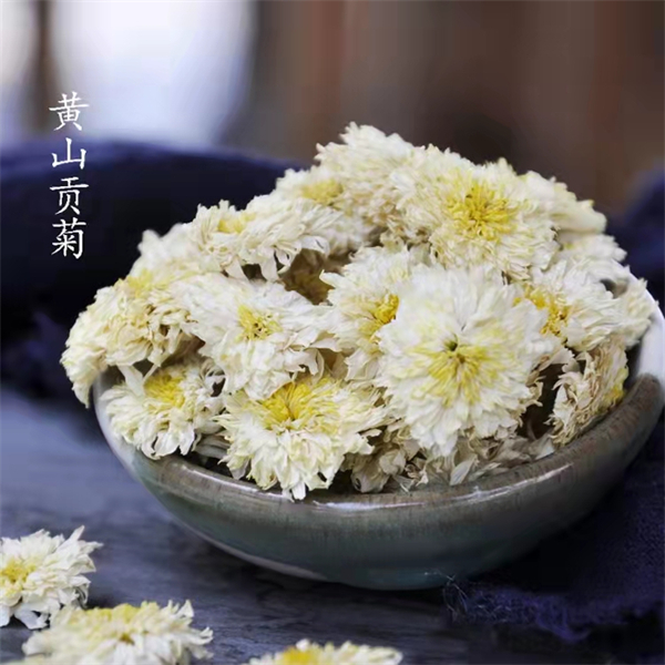 黃山貢菊(又稱徽州貢菊) ,主產黃山歙縣金竹村,當地山高林深,綠水長流,四季分明,溫暖濕潤,得天獨厚的生長環境造就其品質優良,集色、香、味、型於一體。烘制後花形完整均勻不散朵,花瓣潔白,花蒂青綠,花香暖鬱,沖泡下品味甘爽,口感滑膩,清甜回甘,淡雅自然。