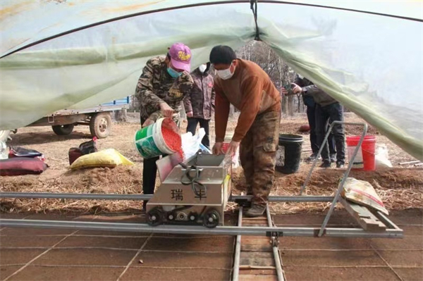 村民用播種覆土拌肥一體機下籽作業 湯原縣委宣傳部供圖