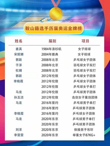 據了解,自1984年洛杉磯夏季奧運會至本屆北京冬奧會,鞍山已經走出了姜英、宋妮娜、郭躍、李曉霞、馬龍、于洋、杜婧、孫玉潔、劉洋、李雯雯、徐夢桃11位奧運冠軍,共奪得16枚奧運金牌,是中國地市級城市中獲得奧運金牌數最多的城市,並成為繼哈爾濱、北京等城市之後為數不多的既有夏季奧運冠軍又有冬季奧運冠軍的「雙奧」冠軍之城。鞍山選手獲得的奧運金牌數不僅數量多,而且含金量極高。其中,馬龍是世界乒壇史上第一位男子雙滿貫、全滿貫得主,是中國歷史上奪得奧運金牌最多的運動員。徐夢桃是中國首位冬奧會自由式滑雪女子空中技巧項目冠軍,她也是世界上第一位空中技巧的大滿貫得主。