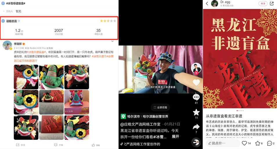 「黑龍江冰雪非遺盲盒」是黑龍江省文化和旅遊廳在第二屆冰雪非遺節期間,依託黑龍江省豐富的非物質文化遺產資源,推出的創意營銷活動。活動期間,甄選了陳氏布藝、樺樹皮畫、剪紙、鰉魚等黑龍江非遺產品,涵蓋了藝術品、美食等多種品類,通過官方微博及微信公眾平台策劃線上招募「非遺體驗官」、非遺問答遊戲等多種形式活動,隨機發放盲盒,充分展示了龍江非遺的獨特魅力。