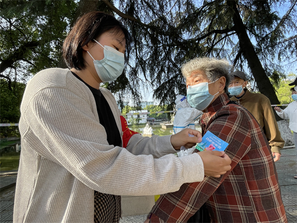 西園新村小區,三里庵街道志願者正在給完成核酸檢測的市民發放溫馨小卡片,以感謝群眾的積極配合(仲名山 詹偉偉 孫雨靜/攝)