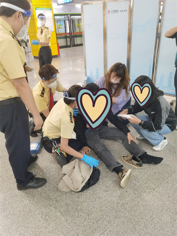 「這應該是心臟驟停,必須立即進行搶救!」梁俊傑和李莉當機立斷將乘客的衣扣和褲頭帶解開,儘量讓乘客的呼吸順暢一些,並開始實施心肺復甦。李莉一邊實施心肺復甦,一邊觀察乘客,乘客依然是呼吸微弱且無意識,現場陪同的妻子反饋其丈夫「心臟不好」。此時,值班站長何佩珊、站務員張曉卉和鄭展明分別攜帶藥箱和AED設備趕到現場。