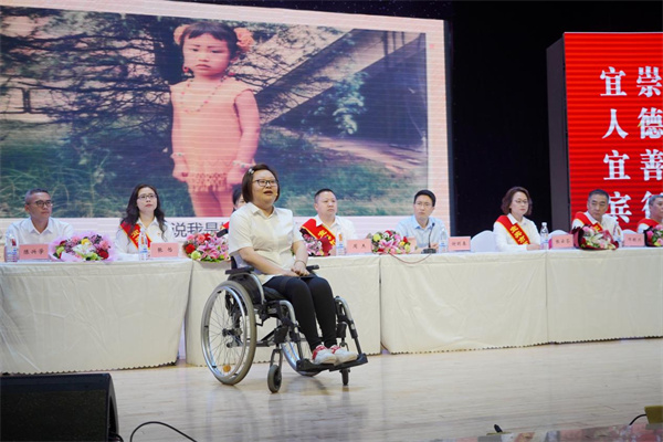 道德模範事跡巡講團成員李祚坐着輪椅作報告