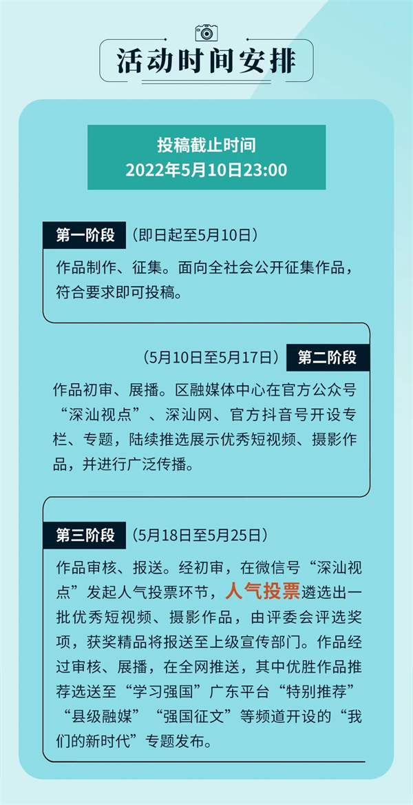4月26日,記者從深汕特別合作區有關部門獲悉,即日起至6月底,深汕特別合作區融媒體中心和深圳特區報聯手策劃組織開展「我們的新時代」短視頻、攝影作品徵集活動,徵集體現深汕建設發展成果、自然文化歷史底蘊的短視頻、攝影作品。
