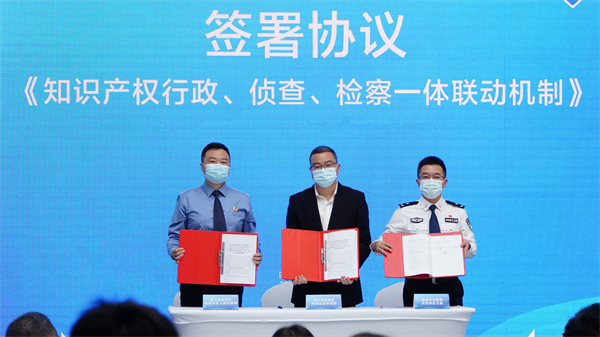 線下,在活動現場,天府新區檢察院、天府新區市場監管局、天府新區公安分局就知識產權行政、偵查、檢察一體聯動工作簽署協議 。根據協議,簽署三方將重點構建知識產權案件信息同步通報機制、知識產權調查取證同步支持機制、知識產權案件線索「雙向移送」機制、知識產權案件矛盾化解協作機制等六大機制。天府新區檢察院、天府新區法院也在現場就知識產權司法保護協作簽署協議。