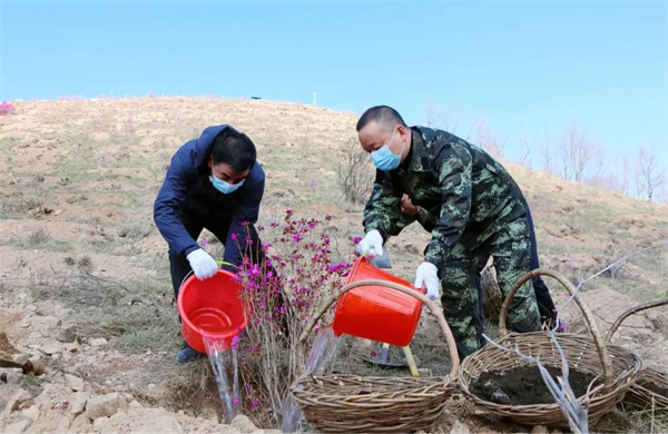來彩雲嶺文化旅遊民俗景區,大家三五人為一組,扶正樹苗、掄鍬鏟土、提水澆灌、固根培苗,每項程序、每道工序均做得一絲不苟,儘管鞋粘泥濘、臉掛汗水,但幹部的興奮勁、合作的密切度使植樹活動快速推進。經過一上午的共同努力,一株株新栽種的映山紅迎風而立,為彩雲嶺增添了勃勃生機。
