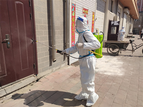 門衛老全說「要加倍工作,清潔小區的衛生環境。」說着他又拿起噴霧器對全院進行消殺了。