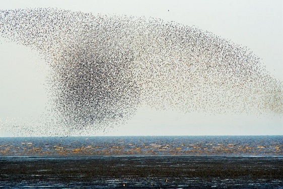 這美輪美奐的一幕,每年都會發生在大遼河口濕地上空。每年4月至5月間,是鴴鷸類萬里大遷徙途中停駐大遼河口地區的高峰期,每天有四五萬隻水鳥雲集在濕地及周邊灘涂上。其中以斑尾塍鷸、大濱鷸等為主。它們從新西蘭、澳大利亞等地起飛,橫跨太平洋,不眠不休連續飛行,一周後到達這裏,停歇覓食補充體力,一個多月後飛往俄羅斯等地。所以,人們稱它們是鳥類中的「馬拉松冠軍」。