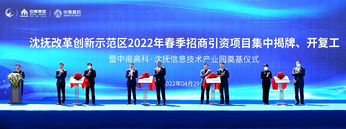 4月29日,在遼寧省瀋撫改革創新示範區2022年春季招商引資項目集中揭牌、開復工暨中南高科·瀋撫信息技術產業園項目奠基儀式上,中國電子科技集團公司第四十七研究所瀋撫研發中心、哈工大機械人集團哈工科訊(瀋陽)工業技術研究院、南京中高知識產權股份有限公司遼蘇合作創新園、瀋陽理工大學遼寧瀋撫產業技術研究院等4個科技創新平台揭牌;中南高科·瀋撫信息技術產業園、遼寧龍芯智慧產業集群、昊晟科技公司高效矽異質結太陽能電池生產裝備製造基地、北斗導航(瀋撫)產業基地等44個項目開復工,協議投資總額達1005.5億元,瀋撫大地戰鼓擂動、號角催征,項目建設掀起新熱潮。