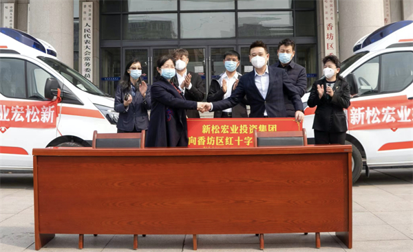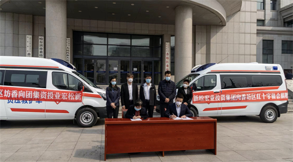 當日下午,捐贈儀式在香坊區人民政府門前舉行,由新松宏業投資集團董事長孫楊與香坊區衛健局黨委書記、局長籍婷現場交接了所捐贈的救護車鑰匙,新松宏業投資集團黑龍江區域總經理黃深與香坊區紅十字協會副會長趙淑萍簽署了捐贈協議,完成了簡易的捐贈儀式。