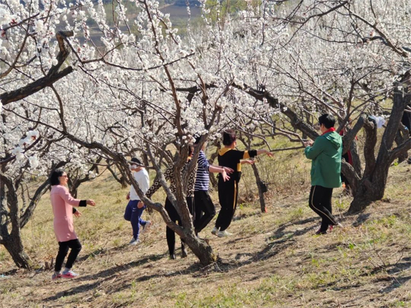 不少市民在閒暇之餘結伴來到百畝杏林踏春賞花、拍照留念,也有遊客在杏林里伴隨音樂翩翩起舞,盡情享受美好春光。(馬淑芬 馬鑫月 王琳)