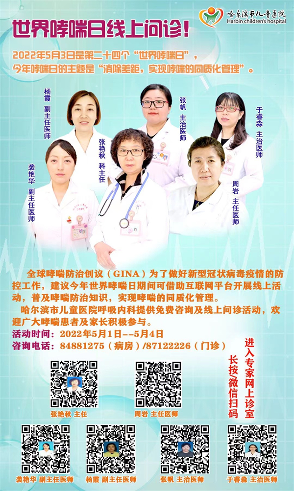 今年5月3日第二十四個「世界哮喘日」主題為「消除差距,實現哮喘的同質管理」。哮喘雖然無法治癒,但哮喘患兒可以得到良好的控制以減少和預防哮喘急性發作。哈爾濱市兒童醫院呼吸內一科開展線上哮喘健康科普教育活動,進一步指導、推進哮喘兒童的管理。