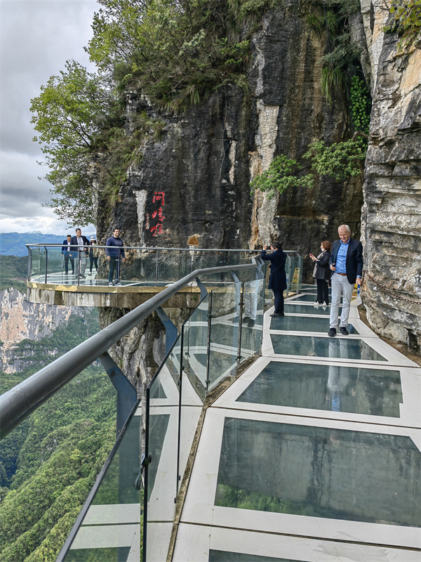雄偉壯觀的自然景觀、崖壁懸空的玻璃棧道、懸挑半空的雲端廊橋、讓史雲森感到流連忘返。他說,雲陽優美的生態環境和豐富的旅遊特色給我留下深入的印象。史雲森表示,將大力推介,讓大使館更多同事和國外的同事,能來重慶、來雲陽走走看看,共同分享這裡的美景。