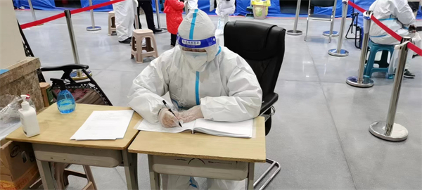 每天穿行在「兩站一場」與社區、隔離賓館之間,平均5個小時完成一次轉運,如果道路狀況或是被轉運人員情況複雜,則會時間更長,場內場外、車內車外溫差三四十度,因為身穿防護服不能隨時更換衣服,他們只能憑藉自身調節,在寒冷與溫暖中不斷切換模式,防護服內衣服濕透,防護鏡內霧水漣漣,又瞬間變為哈氣、冰珠,對於「兩站一場」轉運專班的工作人員來說是再普通不過的事,不能按時吃飯,無暇顧及休息更是日常情況。這些「特殊材料」做成的「守關人」,在疫情防控的關鍵時期周而復始的重複着「規定動作」,危險、忙碌、辛苦、單調,卻從無怨言。他們舍家別子,百里奔赴,克服種種困難,只為守護百姓安全;他們每天連續作戰,沒有節假日和休息日,只為心中那份沉甸甸的責任。