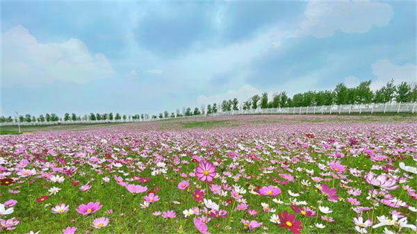 尖山湖逸趣園內約有30畝波斯菊,每年綻放之時,園區內幾乎被花海淹沒。一望無際的波斯菊與民居、鄉道、青山、藍天相映成趣,生命的魅力和旺盛的氣息在這裏盡情鋪灑。據了解,波斯菊是一年生草本植物,花期長,原產於墨西哥,極具觀賞價值,每年如期開放,助力尖山湖逸趣園實現月月有花、季季有果,近幾年吸引無數遊客紛至沓來。