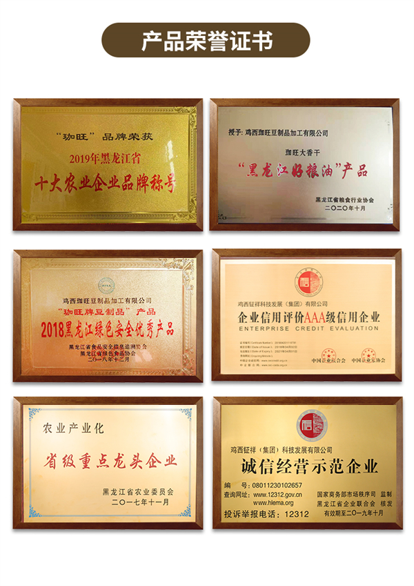 誠信是公司的生存發展之源,公司以質量求生存,以誠信求發展。2017年公司榮獲黑龍江省農業產業化重點龍頭企業;2018年榮獲商務部誠信示範經營企業稱號;2018年榮獲國家AAA級企業稱號;2019年榮獲黑龍江省省級農民創業園區;2019年企業品牌(珈旺)榮獲黑龍江省十大農業企業品牌稱號;2020年,「珈旺大香乾」榮獲「黑龍江好糧油」產品稱號。(記者 張曉磊)