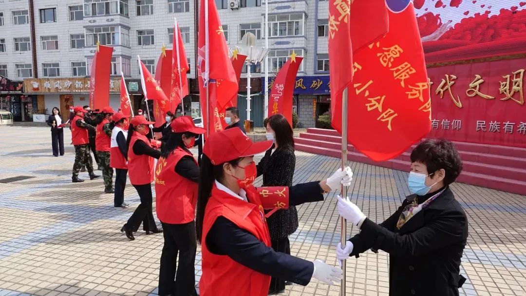 塔河縣領導為塔河鎮林緣社區、繁榮社區、塔林社區、新建社區、塔河林業局工會、塔河「夢之隊」等六支巾幗志願服務隊授旗