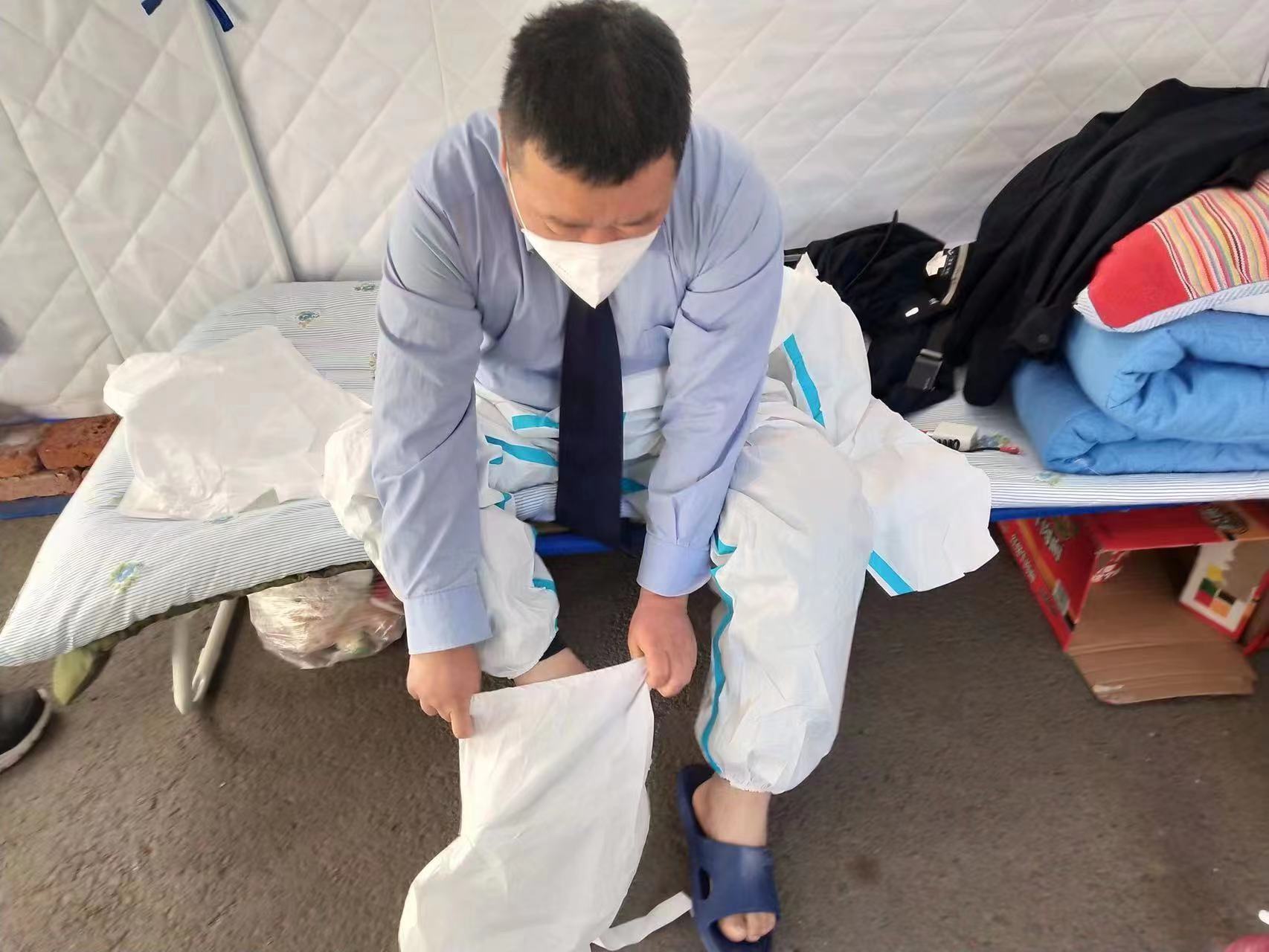 跟母親視頻的時候,他從來都是報喜不報憂,母親看見多日不見,圓臉已經瘦了一大圈的兒子,心疼得直抹眼淚「媽,你看我們支起帳篷了,不用睡車裏了.....媽,你看我們吃的多好,分局給我們送到盒飯有菜有肉,還有水果和牛奶呢!你別哭啊,我沒瘦,我就是沒刮鬍子顯的,等疫情結束去洗個澡就好了,放心吧,我沒事,我們管控的嚴一點,紮實一點,居民就安全一點,風險也會小一點,疫情結束的就早一點。」已經連續堅守了十多天的張建福安慰着母親。他相信只要大家共同努力,我們一定會取得疫情防控的勝利!