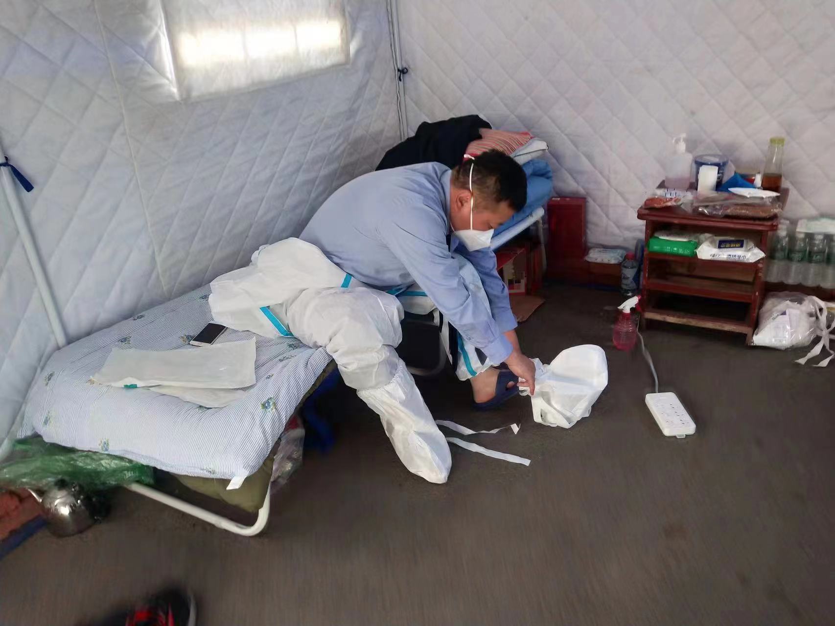 不停的奔忙,腳上磨出了好幾個亮晶晶的大水泡,挑破了用酒精殺毒後,鑽心的疼,別說走路,就連鞋子都不敢提上,他靈機一動找了一雙拖鞋穿上,繼續忙.....「孩子,你跑來跑去只穿拖鞋哪行啊,多冷啊!」門衛的大爺心疼地說。「沒事,我都跑熱了,您看看....」張建福給大爺看他防護面罩下滿是汗珠的臉。