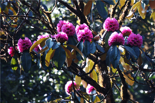 全世界約有杜鵑屬植物800——900種,中國約有650種,而高黎貢山就有140種,其中高黎貢山特有種達41種。既有矮小灌木,僅有幾十釐米高,也有高大喬木,樹高達30多米;既有形成純林或建群樹種的種類,還有的呈墊狀灌叢,覆蓋在高山地帶,花開時節燦若雲霞。花期由11月至次年8月,幾乎四季不斷,是優質的野生種質資源。