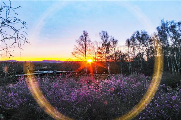 黑龍江豐林世界生物圈保護區,位於伊春市小興安嶺南坡北段。興安杜鵑又稱韃子香、東北滿山紅、金達萊、映山紅,通常是先開花後展葉,紫紅色的花冠嬌豔耀眼,素來被當作春天的使者,是堅貞、美好、吉祥、幸福的象徵。