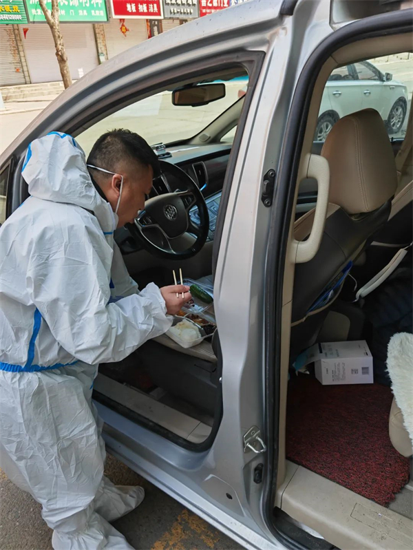石永輝把家安在了地礦小區,一直住在車裏,白天黑夜連軸轉已經成了他工作的日常。每天區里「點長」培訓會後,石永輝便是上級精神和要求的傳達者、落實者、反饋者,工作信息回復、居民問題解答,每一項都落到實處。在小區,他是一個大管家,秩序維護、上門檢測,各種防疫物資、居民的生活用品以及行動不便人員的醫藥需求等等,他都要一一過問、溝通,同時還要確保被隔離人員解除後與街道、社區工作人員對接,讓他們順利回家做好個人健康監測,他是「中轉站」也是「連心橋」。