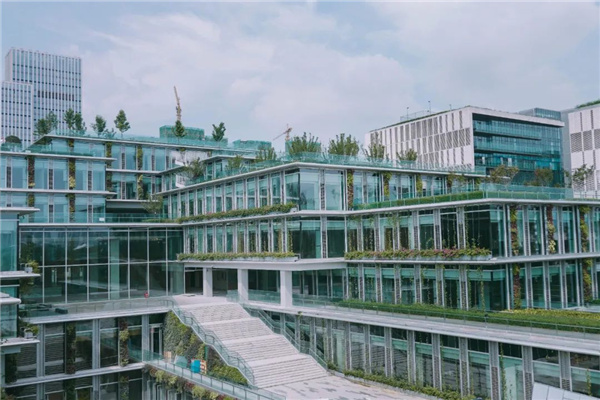 探訪其間,這裏的每一棟樓頂都有屋頂花園。建築的至高處是「天空運動場」。建築的外立面栽種了本土植物油麻藤形成垂直綠化,形成獨特的「植物遮光簾」,還有迷你天空農場。隨便打開一間辦公室就能縱享4500畝的興隆湖景。