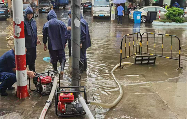 江海區禮樂街道工作人員疏導交通和抽走路面積水