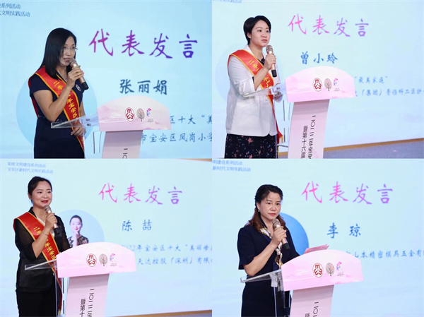 當天,2021年全國「最美家庭」——蔡婉清、賴海峰家庭,2021年廣東百戶「最美家庭」——謝嘉嘉、曾小玲家庭,2022年寶安區十大「美麗母親」——張麗娟、徐婧、車順愛、陳喆、張紅、郝琳慧、黃曉君、蔡佩英、田婷浩、彭淑芳,精彩亮相。出席活動領導為她們頒發了榮譽證書。現場,4位來自寶安區的優秀家庭和母親代表還和大家分享了她們在個人成長、家庭經營中的心路歷程和感人故事,激勵更多人投入寶安「三城」建設。