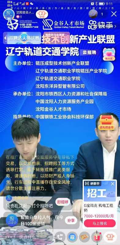 為貫徹落實新職業教育法,推動2022年職業教育活動周、高校畢業生就業促進周活動順利開展。5月15日,在中國鋼鐵工業協會科技環保部、中國瀋陽人力資源服務產業園以及瀋陽金谷人才市場的大力指導支持下,由輥壓成型技術創新產業聯盟、遼寧軌道交通職業學院輥壓產業學院、遼寧軌道交通職業學院、瀋陽東洋異型管有限公司四家單位共同舉辦的雲招聘專場會如期召開。