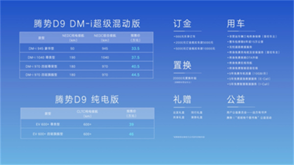 在此次發佈會上,騰勢品牌全新戰略下的首款車型——騰勢D9正式開啟預售,共帶來DM-i超級混動和純電共6個配置版本,預售價格區間為33.5萬元-46萬元;另外,還推出一款創始版車型,預售價為66萬元,限量發售99台。